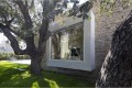 La maison au dessin moderne s’intègre dans une vaste étendue de gazon ombragé par les arbres dont des oliviers centenaires que le chantier de construction a pris soin d’épargner. Derrière la maison, une terrasse en carreaux de ciment forme un tapis géométrique au milieu du gazon et accueille fauteuils contemporains et table basse à l'ombre des pins.