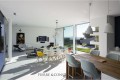 L’immense séjour en L s’ouvre sur le jardin et la piscine, grâce à des baies coulissantes en aluminium thermo laqué blanc dont la technologie leur permet de sembler disparaître. Une pergola contemporaine intégrée au bâtiment apporte de la fraîcheur à la terrasse recouverte de dalles de pierre blanche.